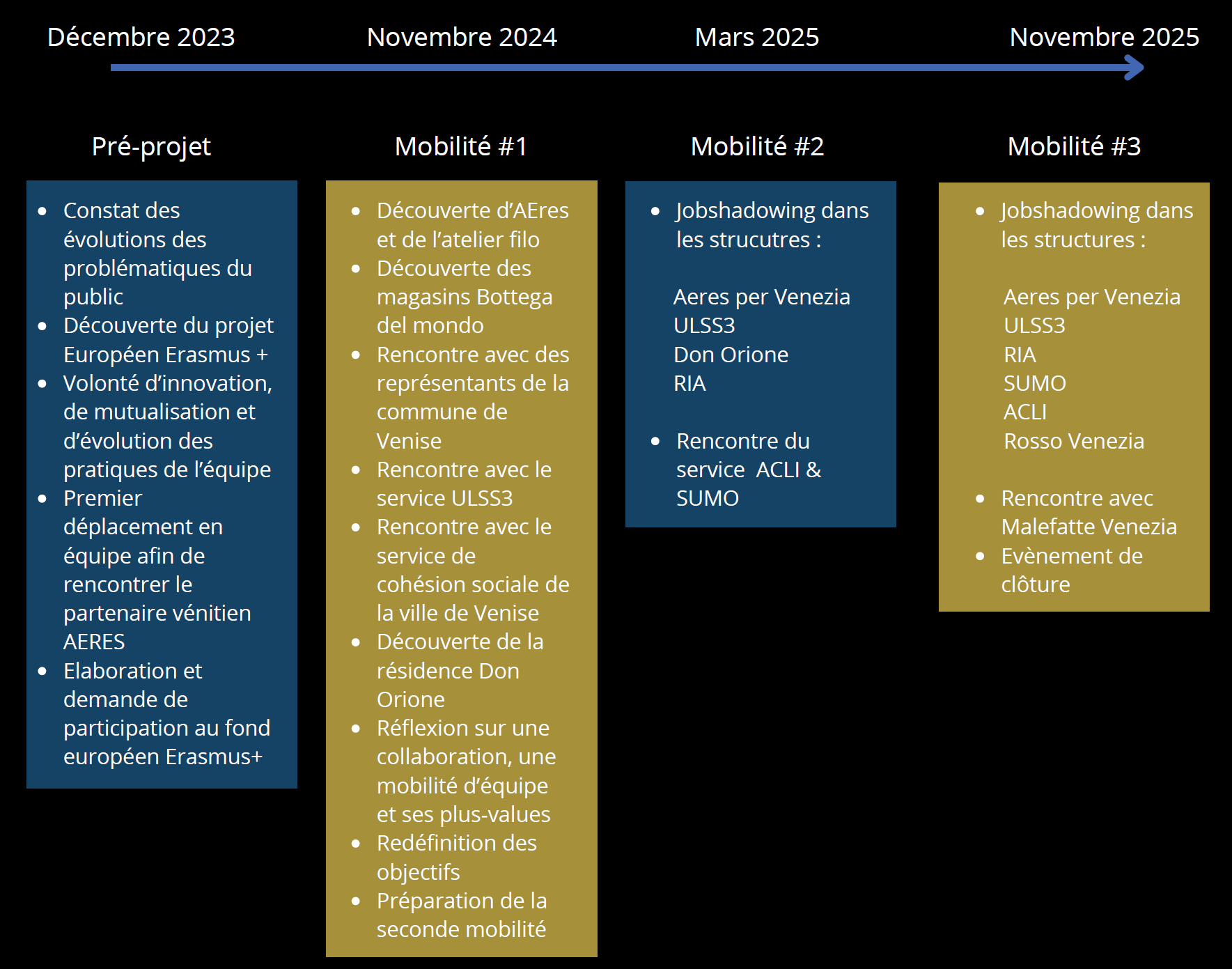 En décembre 2023, nous avons organisé une mobilité pré-projet en rencontrant Aeres Venezia en nous rendant en Italie. En février 2024, le président de l’association est venu nous rencontrer. Nous avons pu échanger avec lui, lui présenter une partie de nos activités et réfléchir ensemble à la suite de notre projet. Nous avons réaliser une ligne du temps que nous annexons à ce projet.